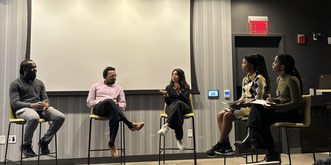 After the presentation, we hosted a panel discussion featuring Marcus Shaw (Mental Health Worker at the Solomon Carter Fuller Mental Health Center; Academic Advisor in BU Sociology and African American and Black Diaspora studies; MSW candidate at BU School of Social Work), Denzel Samuel (MBA Candidate at BU Questrom School of Business), and Malvi Khandelwal (PhD student in Sargent College’s Speech Language and Hearing Sciences program). Our panelists represented various professional spheres, including academic advising, doctoral & professional studies, community engagement, and investment management. They shared insights on navigating workplace settings, advocating for oneself in professional contexts, and leading with authenticity at the forefront of their work.
